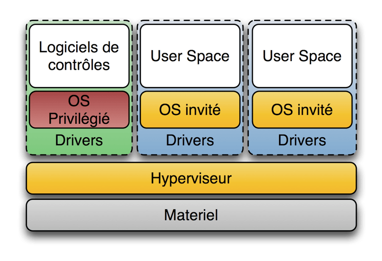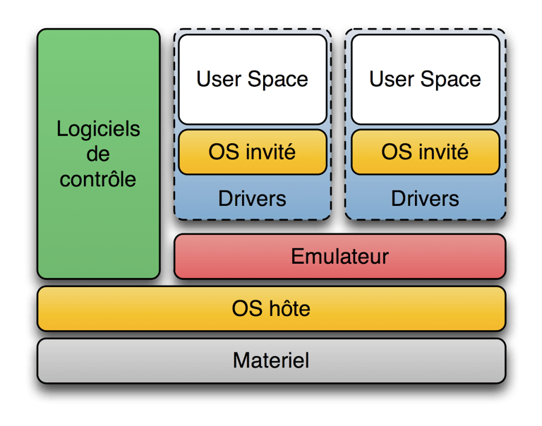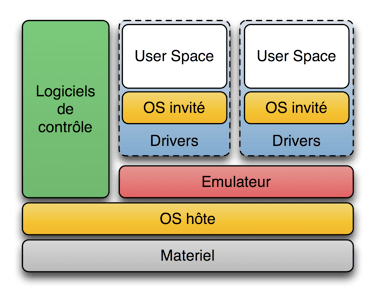 Le noyau en espace utilisateur est un noyau tournant indépendamment du système hôte. Le système invité à son propre espace utilisateur au sein du quel il contrôle ses applications.